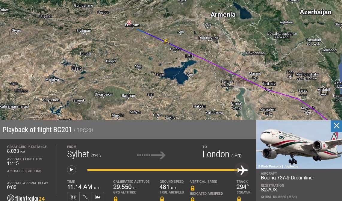Bangladeş havayolu şirketi Biman Bangladeş Airlines şirketine ait BG201 sefer sayılı Sylhet – Lonra seferini yapan S2-AJX tescilli Boeing 787-9 Dreamliner tipi uçağın pilotları Türk hava sahasında bir yolcularının rahatsızlanması üzerine Erzurum Havalimanı’na yönelme kararı aldılar.