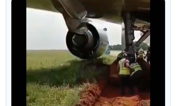 Airplane skids off runway and gets stuck in the mud in Murtala Muhammed International Airport, Ikeja, Lagos pic.twitter.com/ASlNVWQOgc