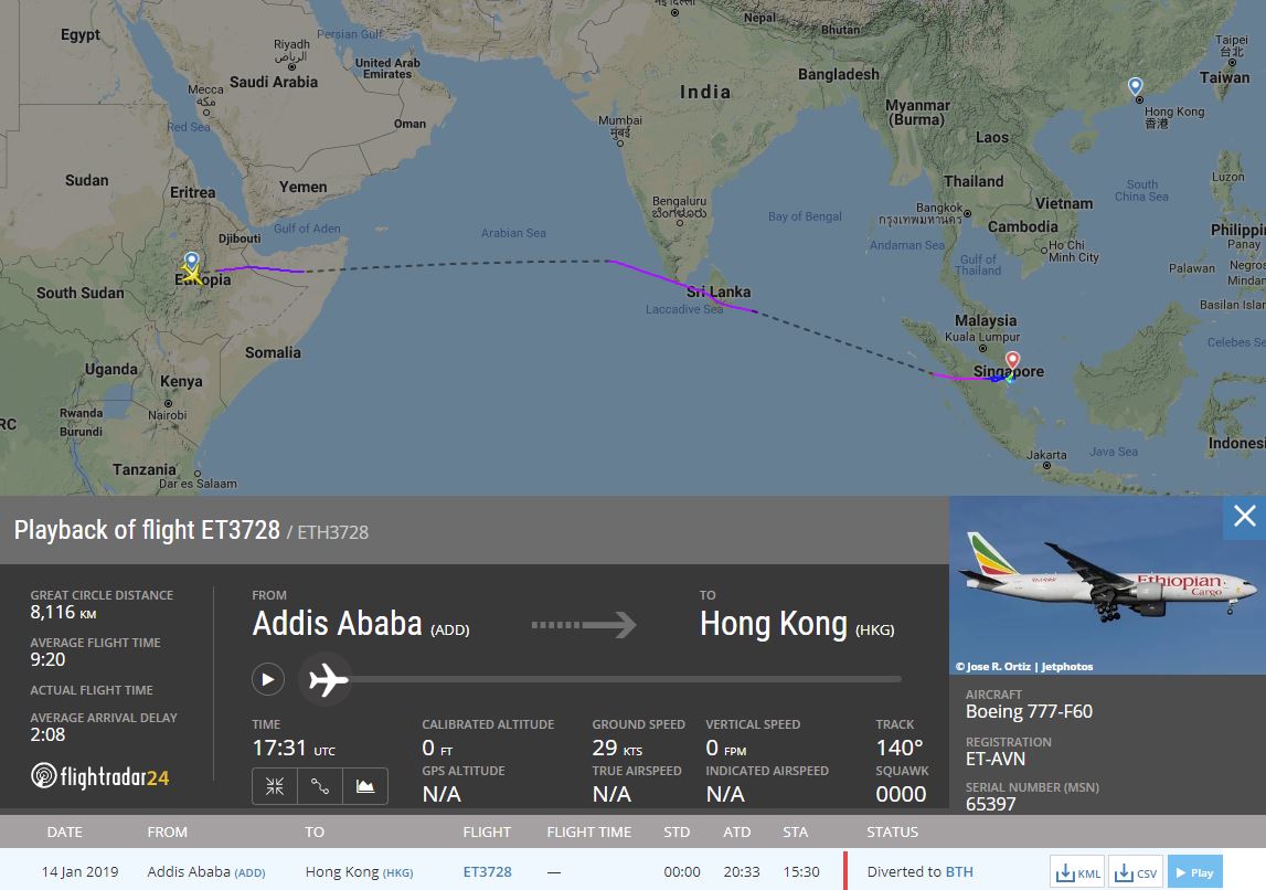 Etiyopya havayolu şirketi Ethiopian Airlines şirketinin kargo kolu olan Ethiopian Cargo’ya ait ET3728/ETH3728 sefer sayılı Addis Ababa – Hong Kong seferini yapan ET-AVN tescilli Boeing 777-F60 tipi uçak normal rotasının dışına çıkarak izinsiz olarak Endonezya havasahasına girdi. İzinsiz olarak Endonezya havasahasına giren uçak için Endonezya Hava Kuvvetleri’ne ait iki adet F-16 tipi savaş uçağı önleme yapmak üzere havalandı. Uçağın yanına gelen savaş uçağı pilotları kargo uçağının pilotları ile bağlantıya geçerek Endonezya’nın Batam Havalimanı’na mecburi iniş yapmalarını söyledi. Yapılan mecburi inişin ardından uçağın güvenli bir yere park ettirildiği öğrenildi.