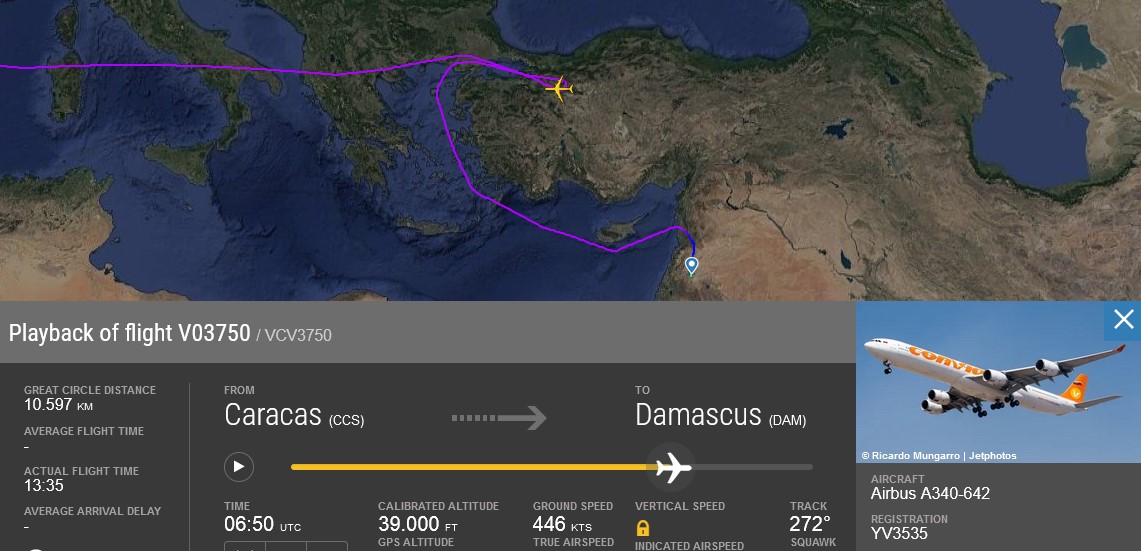 Venezuela havayolu şirketi Coviasa şirketi Caracas – Şam uçuşlarına başladı. YV3535 tescilli Airbus A340-642 tipi uçak ile yapılan V03750/VCV3740 sefer sayılı ilk seferin rotası Türk Havasahasından geçiyordu. Ancak Türk Hava sahasında seyreden uçak Ankara semalarından geri dönerek Ege Denizi – Akdeniz ve Kıbrıs yakınlarından geçen rota ile Şam Havalimanı’na varabildi.