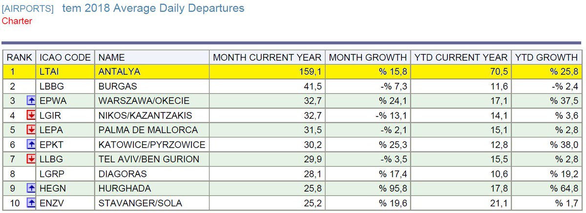 CHARTER UÇUŞLARDA ANTALYA HAVALİMANI’MIZ AVRUPA BİRİNCİSİ Temmuz ayında Eurocontrol İstatistiksel Referans Bölgesi’nde charter uçuşlarda Antalya Havalimanı günlük ortalama 159.1 kalkışla İLK SIRADA yer aldı.