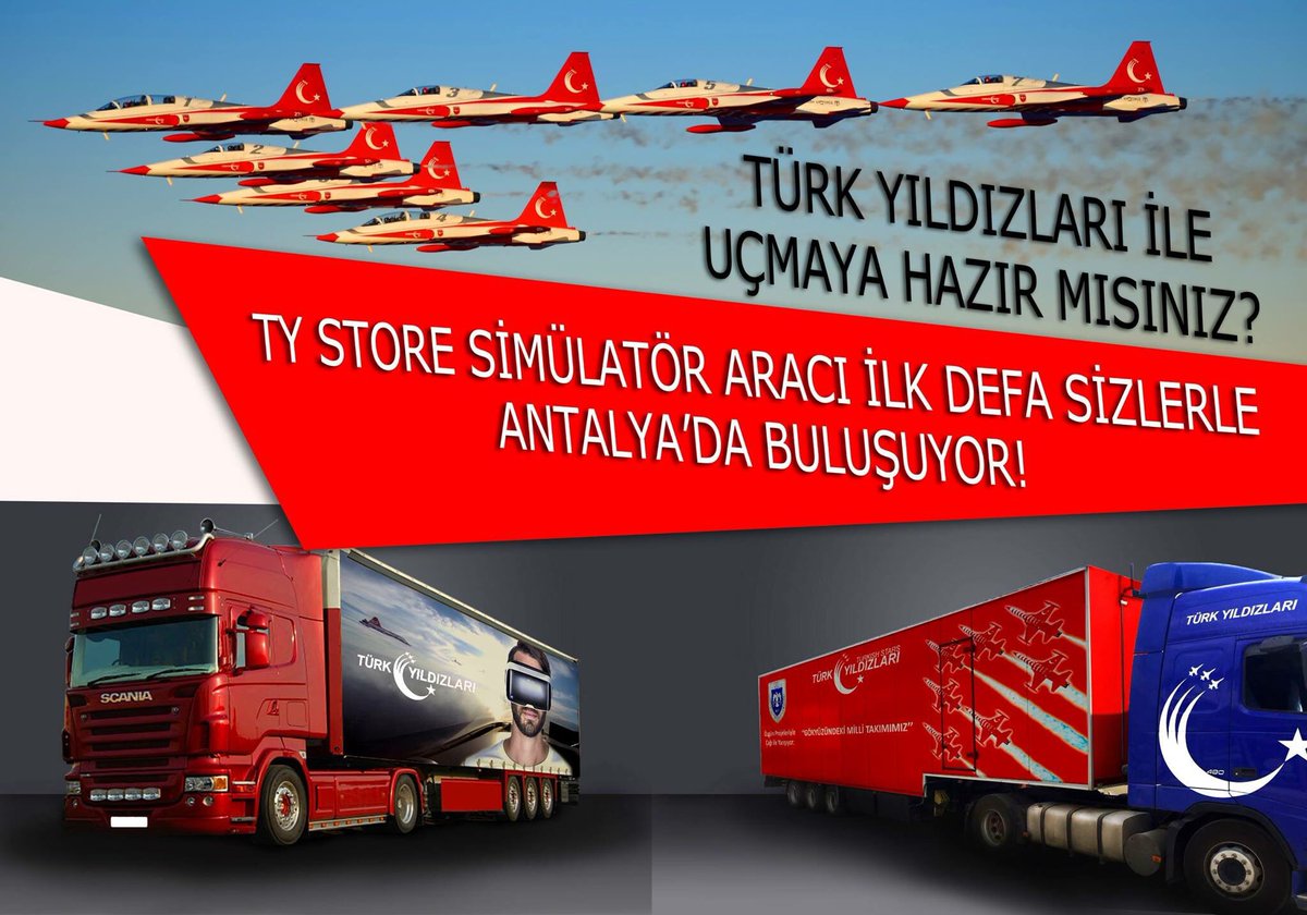 Türk Yıldızları akrobasi timi 23 Nisan 2017 tarihinde planlı Antalya – Konyaaltı sahilinde 23 Nisan Ulusal Egemenlik ve Çocuk Bayramı sebebiyle bir gösteri yapacak. Antalya’daki gösteride ilk defa hemen her gösteride yer alan lisanslı Türk Yıldızları ürünleri satılan TY Store aracıyla birlikte birde Türk Yıldızları TY Simülatör aracı havacılık meraklıları ile buluşacak. İçeriği henüz açıklanmayan simülatörün duyurusunu Türk Yıldızları resmi sosyal medya hesabından ” Türk Yıldızları İle Uçmaya Hazırmısınız?” sloganı ile böyle duyurdu: