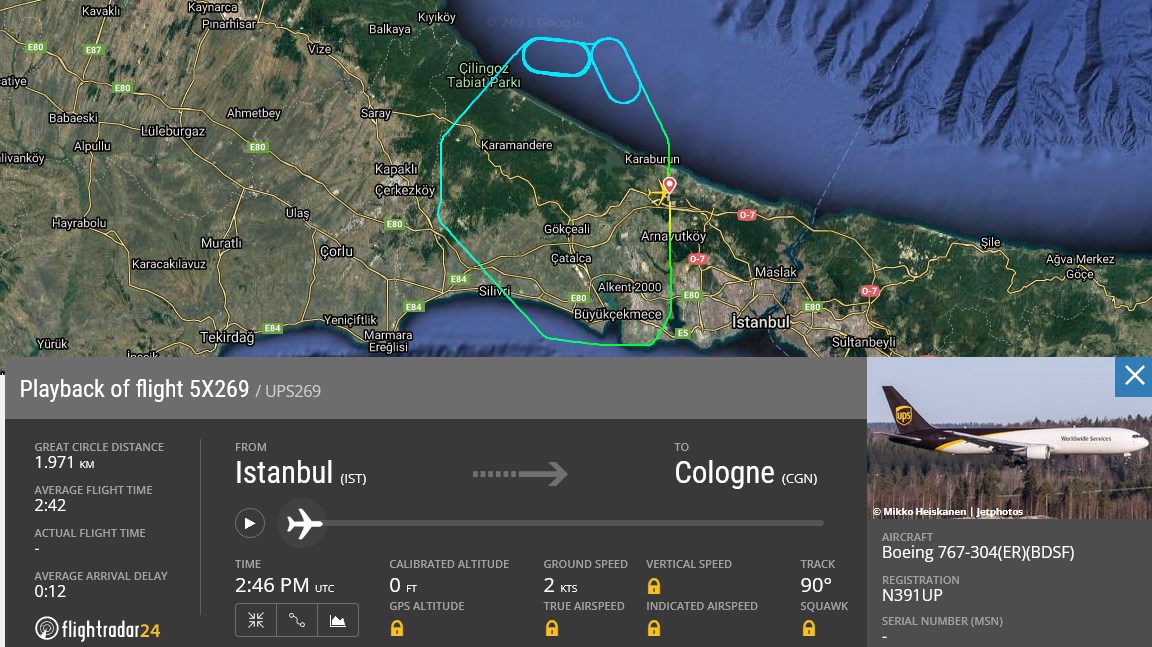 amerikan kargo şirketi UPS Cargo şirketine ait 5X269/UPS269 sefer sayılı İstanbul Havalimanı – Köln seferini yapan N391UP tescilli Boeing 767-304ER tipi uçağın pilotları henüz bilinmeyen bir nedenden dolayı tırmanışlarını 12000 feet seviyelerinde durdurup Karadeniz üzerinde turlamaya başladılar.