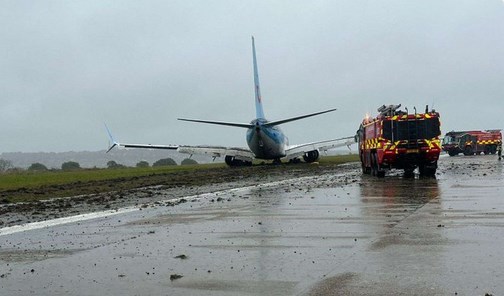 The TUI flight from Corfu came to a standstill on boggy grassland leaving more than a hundred passengers stranded.